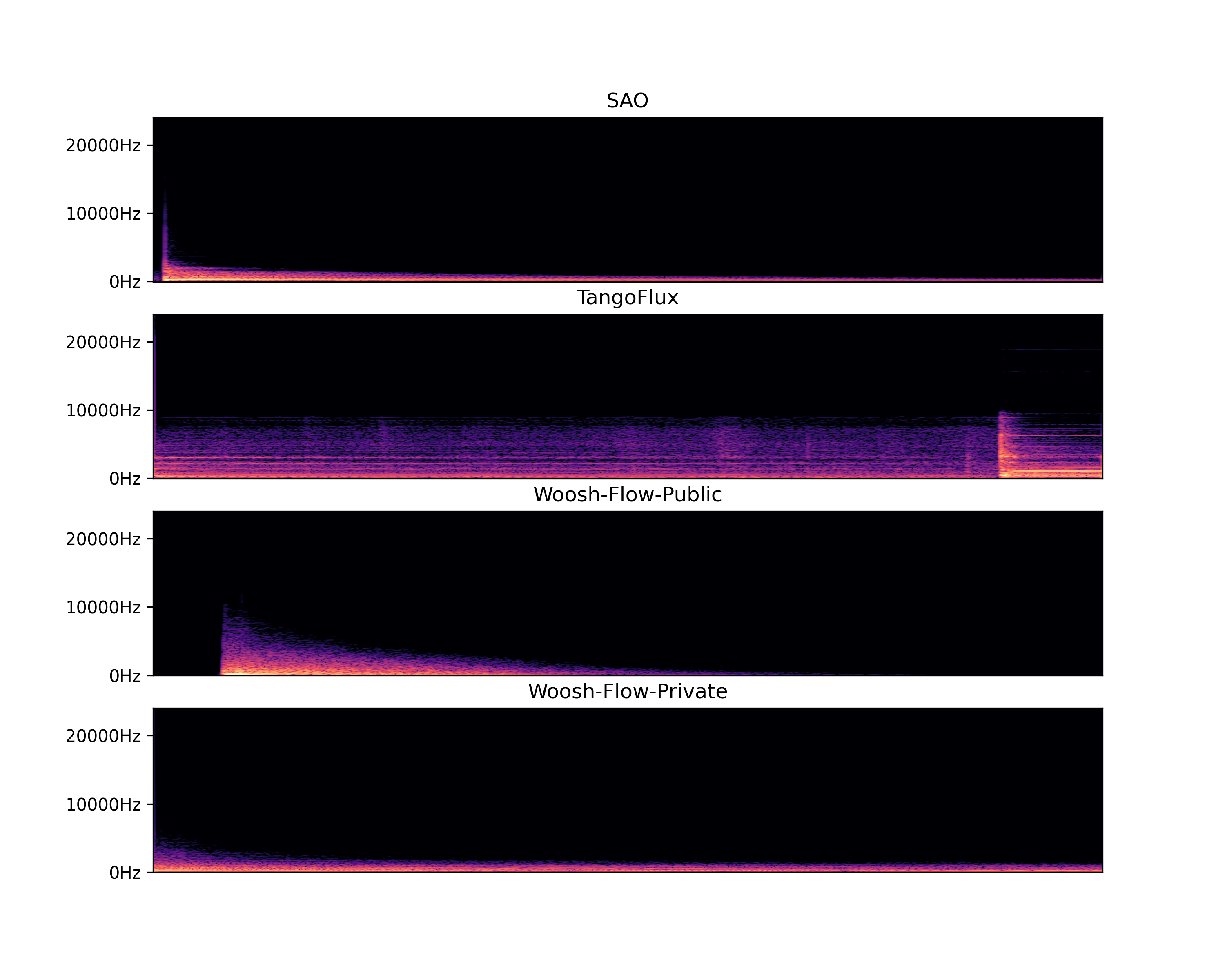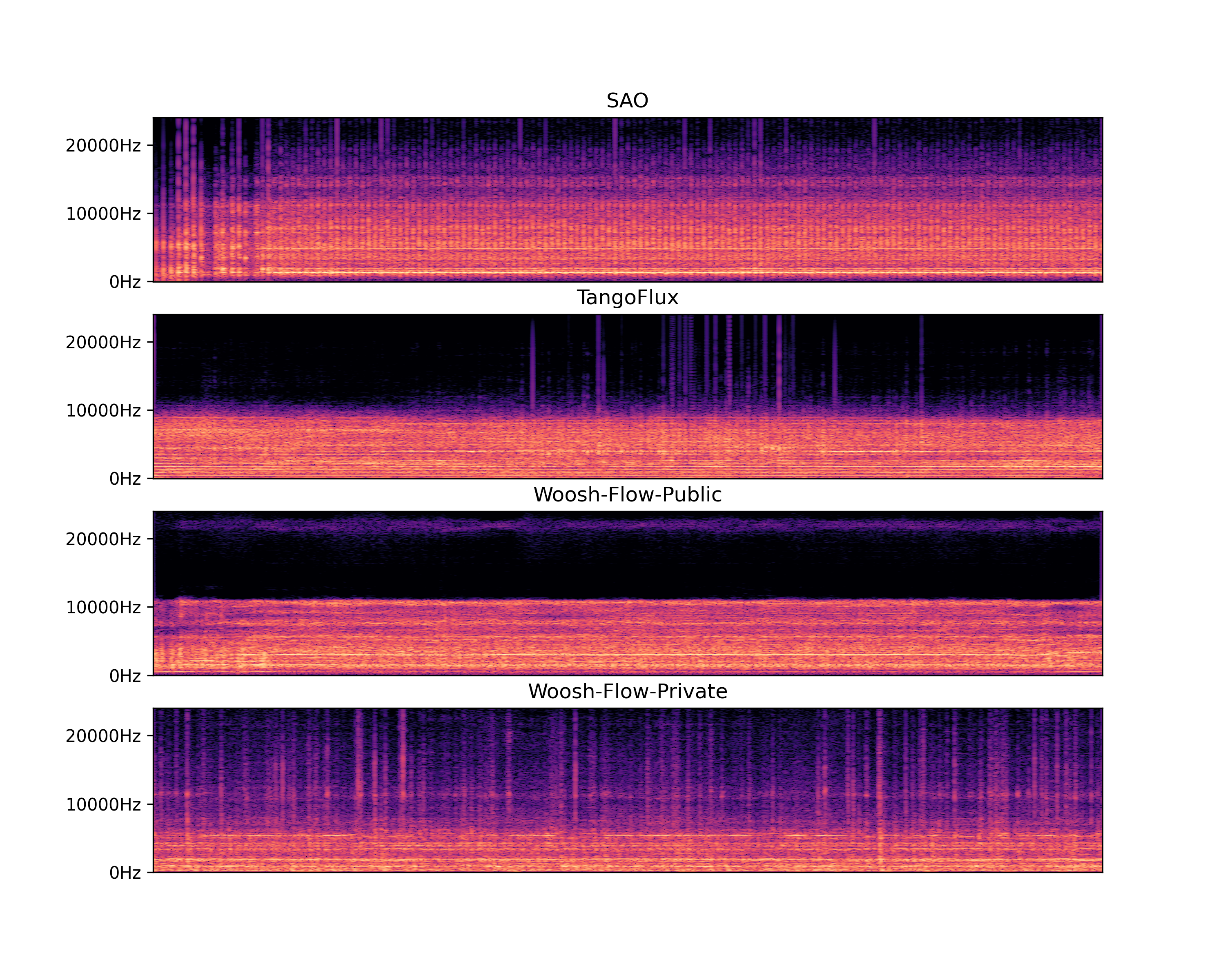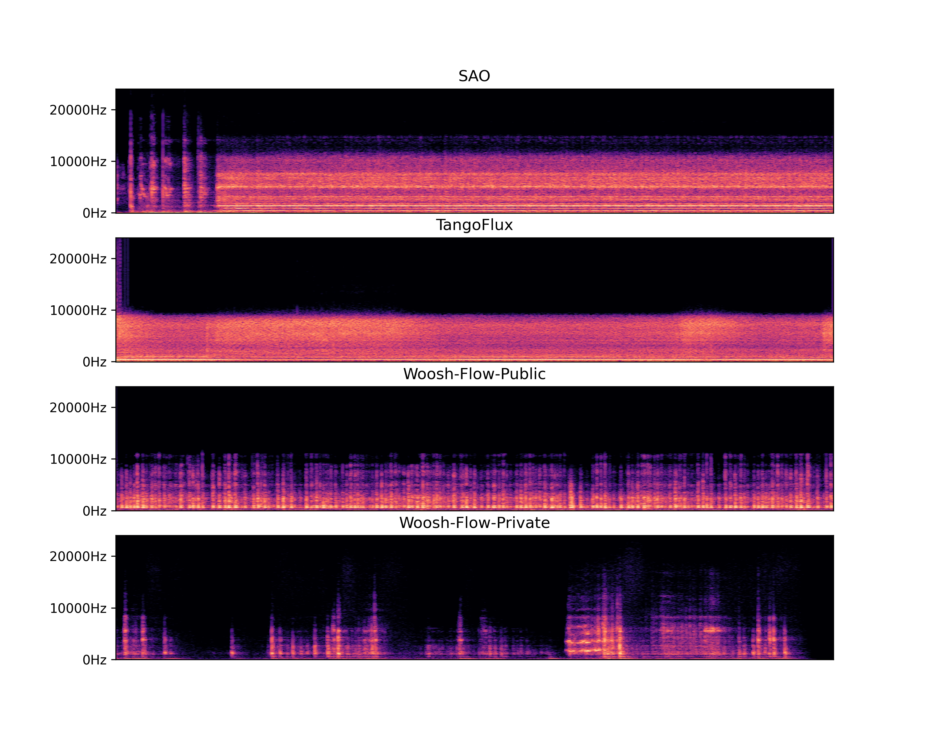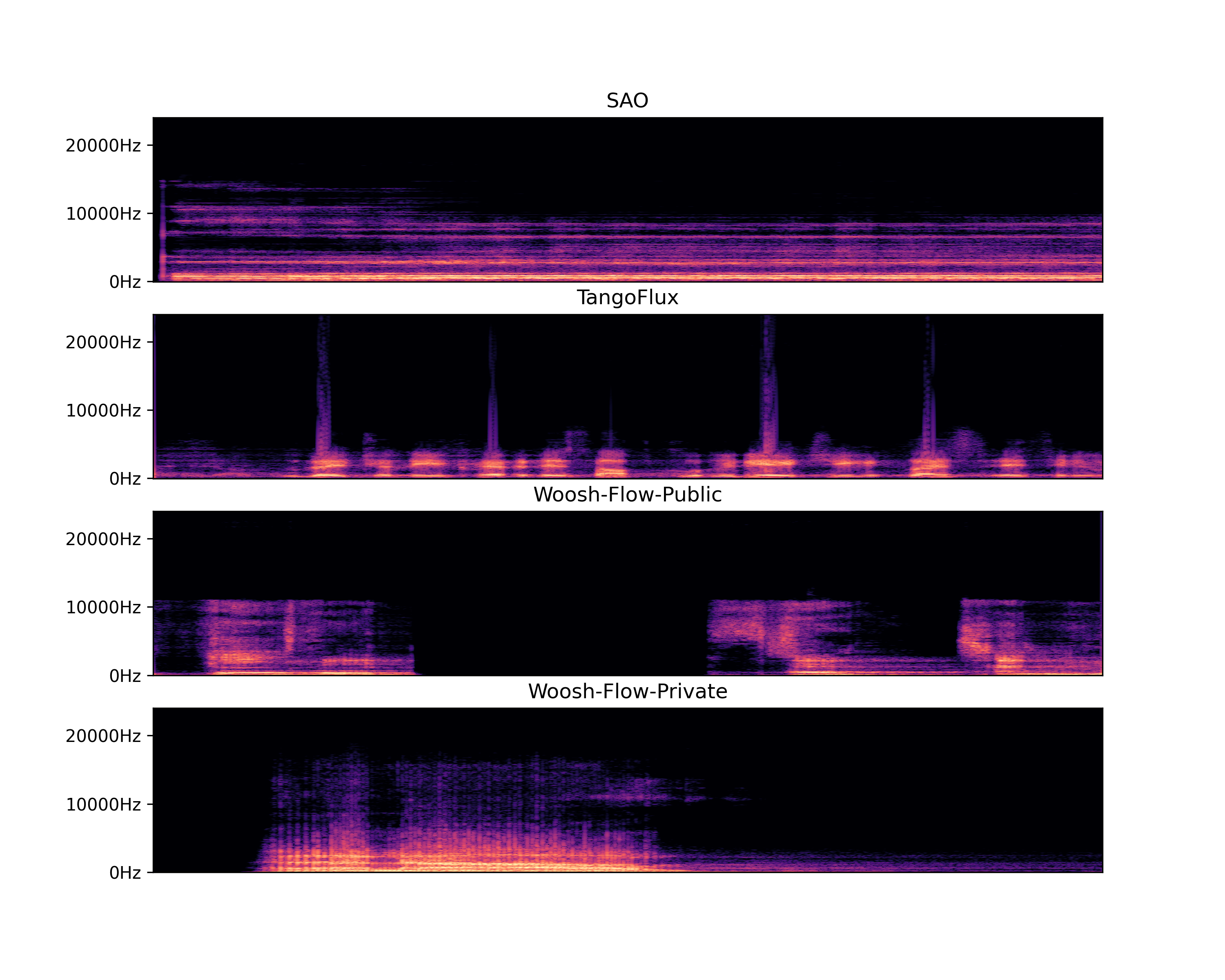 We compare our private Woosh-Flow model against Woosh-Flow Public and other baselines.